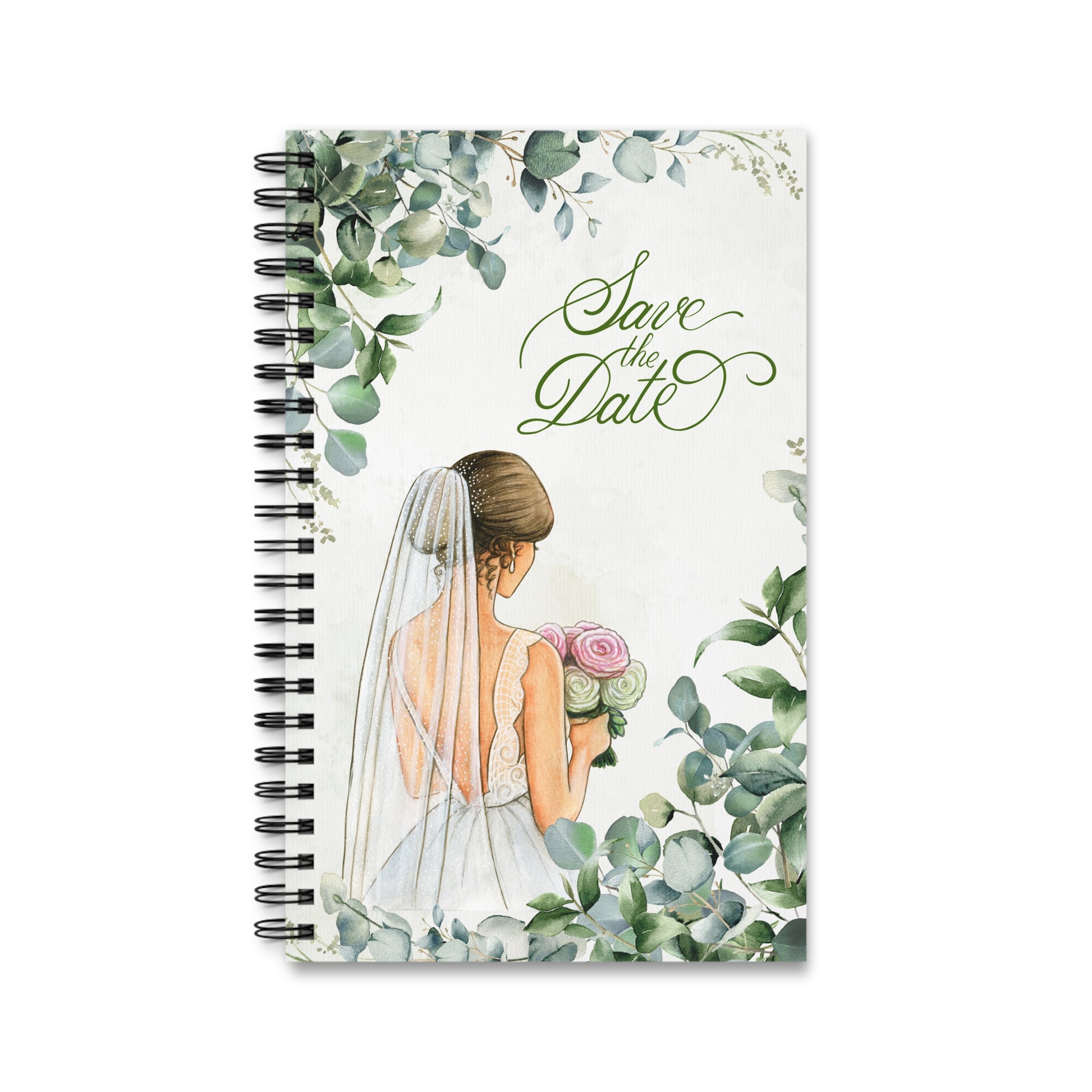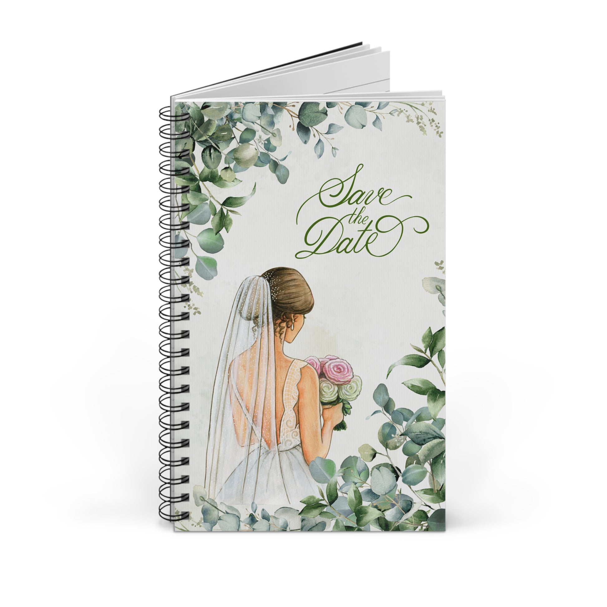 Tento krásný spirálový zápisník je dokonalým místem pro uchování vzpomínek na svatební den. Romantický a elegantní design s ilustrací nevěsty zezadu, v krajkových šatech s dlouhým závojem, doplněný jemnými zelenými listy, dodává deníku svěží a přírodní atmosféru.